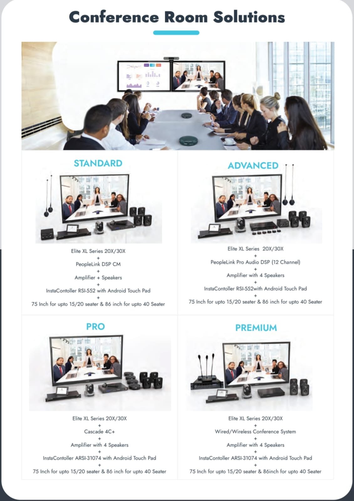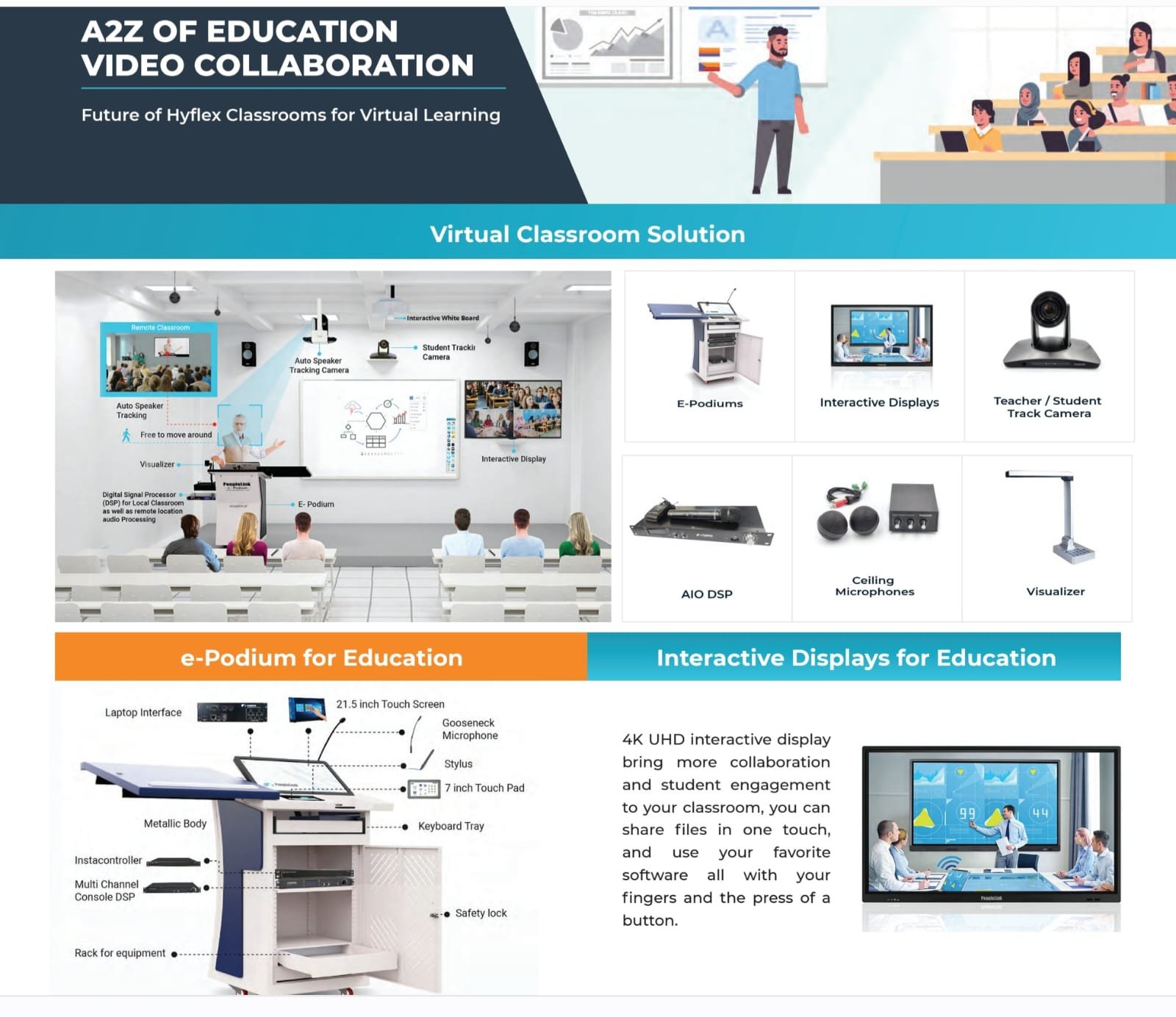 We provide end-to-end AV ecosystems including interactive touch displays, PTZ and auto-tracking cameras, ceiling and wireless microphones, digital signal processors (DSP), e-podiums, control panels, and room automation solutions. These components work together to ensure consistent performance, ease of use, and scalability across different room sizes and applications.