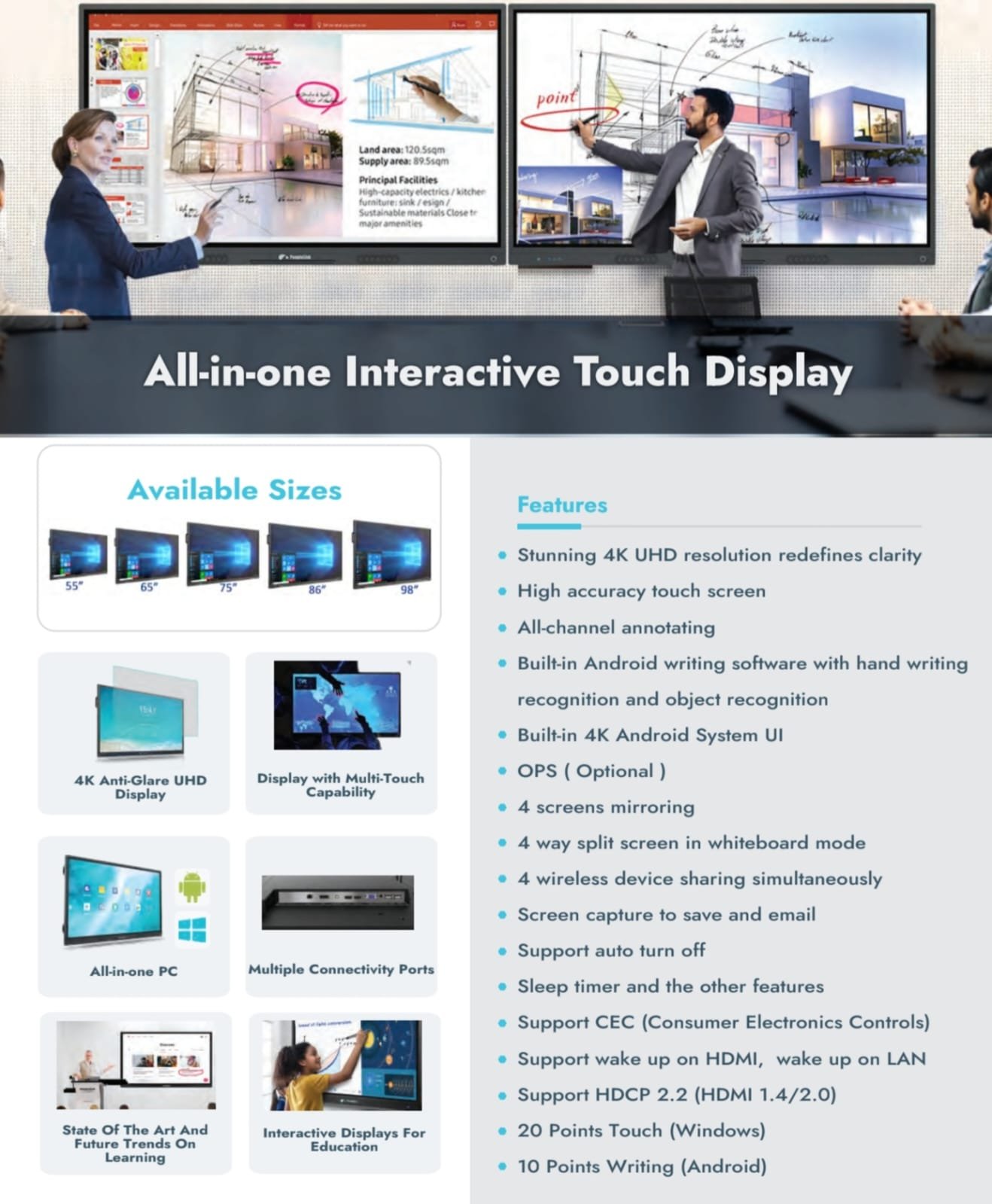 Adcom Securitas Pvt. Ltd. delivers Premium Interactive Audio-Video Solutions that transform conference rooms, classrooms, and collaborative spaces into intelligent, connected environments. Our solutions integrate high-resolution interactive displays, advanced video conferencing systems, professional audio processing, and smart control technologies to create seamless communication and immersive user experiences.